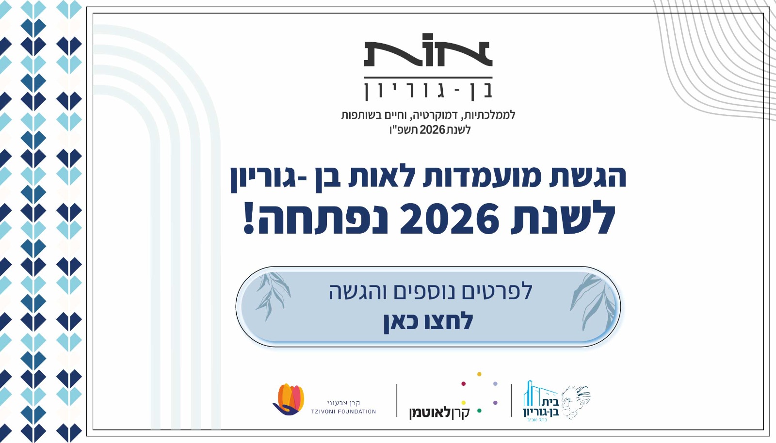 אות בן-גוריון לממלכתיות, דמוקרטיה וחיים בשותפות הושק ויושם לראשונה בשנת תשפ"ג. האות הוא תוצר של שיתוף פעולה בין בית בן גוריון בתל אביב, קרן לאוטמן וקרן נדב שחברו יחד במטרה להצמיח, לעודד ולהוקיר מצוינות חינוכית המקדמת את הערכים של ממלכתיות, דמוקרטיה וחיים בשותפות. ב -7/10/23 השתנו פניה של מדינת ישראל. ממדינה שהייתה עסוקה בוויכוח אודות אופייה הדמוקרטי והסמכויות של המערכת המשפטית בפרט, הפכה המדינה להיות מדינה במלחמה. מדינה שעוקבת בדריכות אחרי שלום חייליה, בהחזרת אזרחים חטופים לשטחה, בשיקום של חבל ארץ ובטיפול במאות אלפי עקורים. למעשה, הפכה המדינה להיות כזו העסוקה בעיקר בהכלת כאב ובציפייה לסיום המלחמה. המלחמה תגמר, בסופו של דבר וישראל תשנה את פניה. החברה הישראלית תצטרך לא רק לטפל בפצעיה, אלא גם ובעיקר לבנות לעצמה עתיד חדש ואחר. אות בן-גוריון, מייעד את עצמו להיות המגדלור הערכי של היום שאחרי. גם אז, עם שוך הקרבות, בין אבני הבניין של החברה הישראלית של היום שאחרי, יהיו חייבות להיות לבני הממלכתיות, הדמוקרטיה והחיים בשותפות. הן יהוו בסיס איתן ומשותף לכלל החברה הישראלית.
